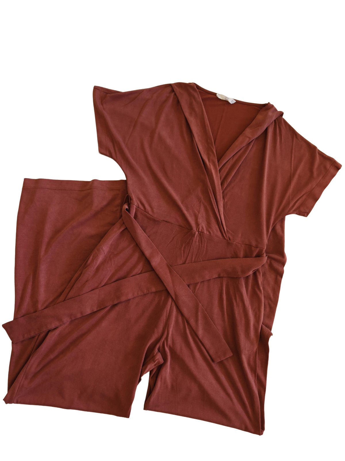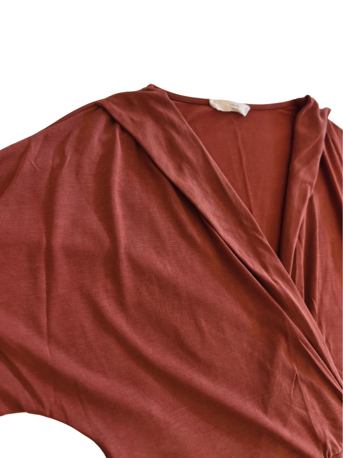 État : Occasion – Très bon état Cette combinaison courte signée Mango séduit par sa teinte roux et sa coupe portefeuille relax. Avec son encolure en V, sa taille marquée et ses manches courtes, elle incarne une élégance douce et décontractée, parfaite pour les journées ensoleillées ou les looks estivaux affirmés. Taille : S Couleur…
