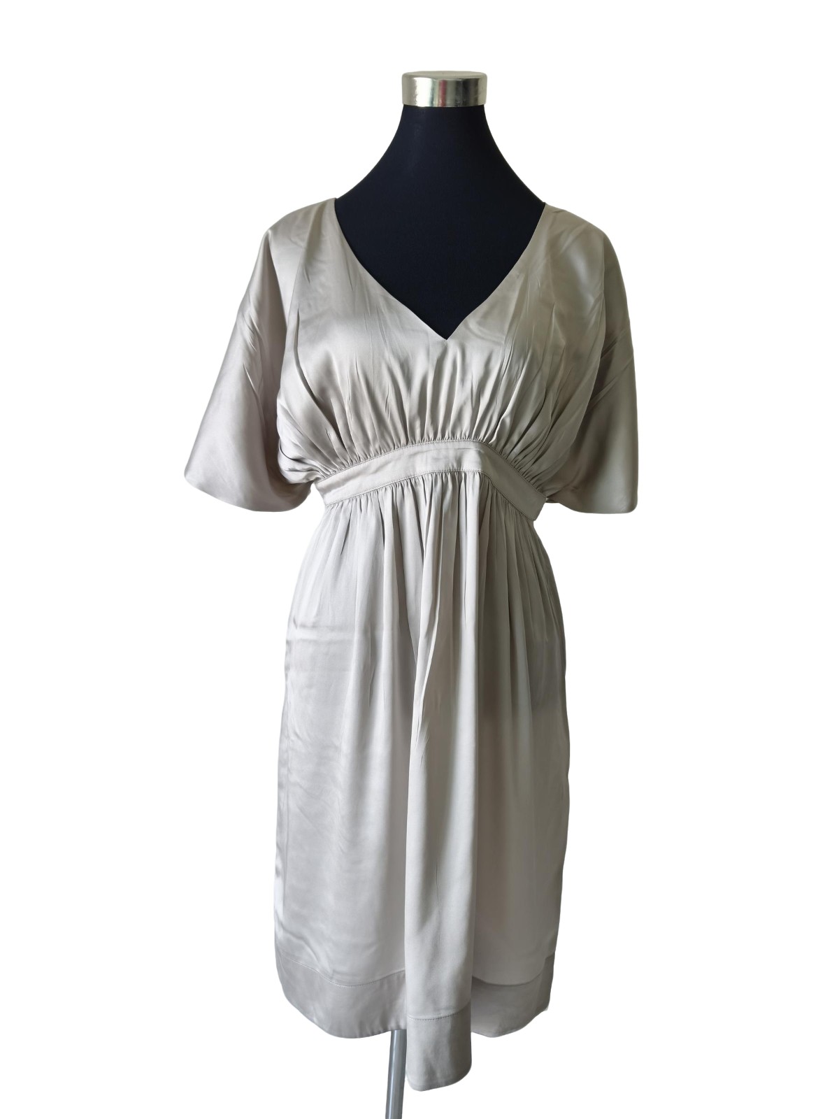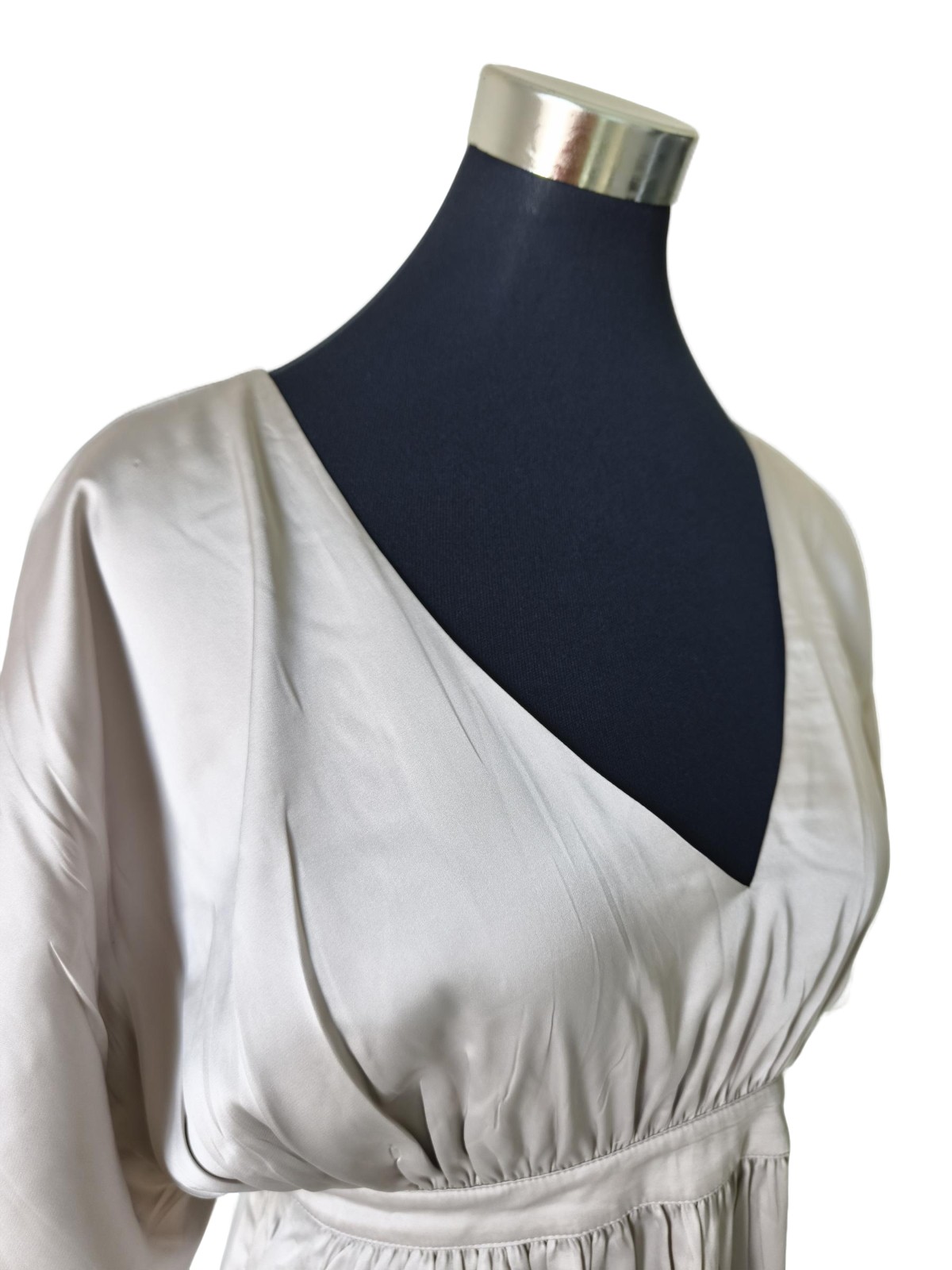 Cette robe champagne signée H&M séduit par sa coupe empire et son allure aérienne. Avec son col en V, ses manches courtes façon kimono et sa taille froncée à lien, elle incarne une élégance douce et subtile, idéale pour les occasions raffinées ou les journées lumineuses.
