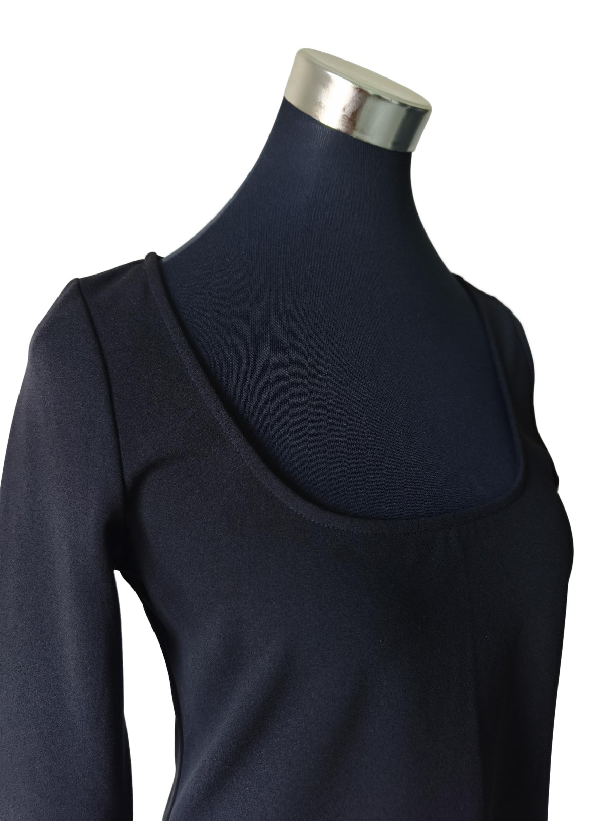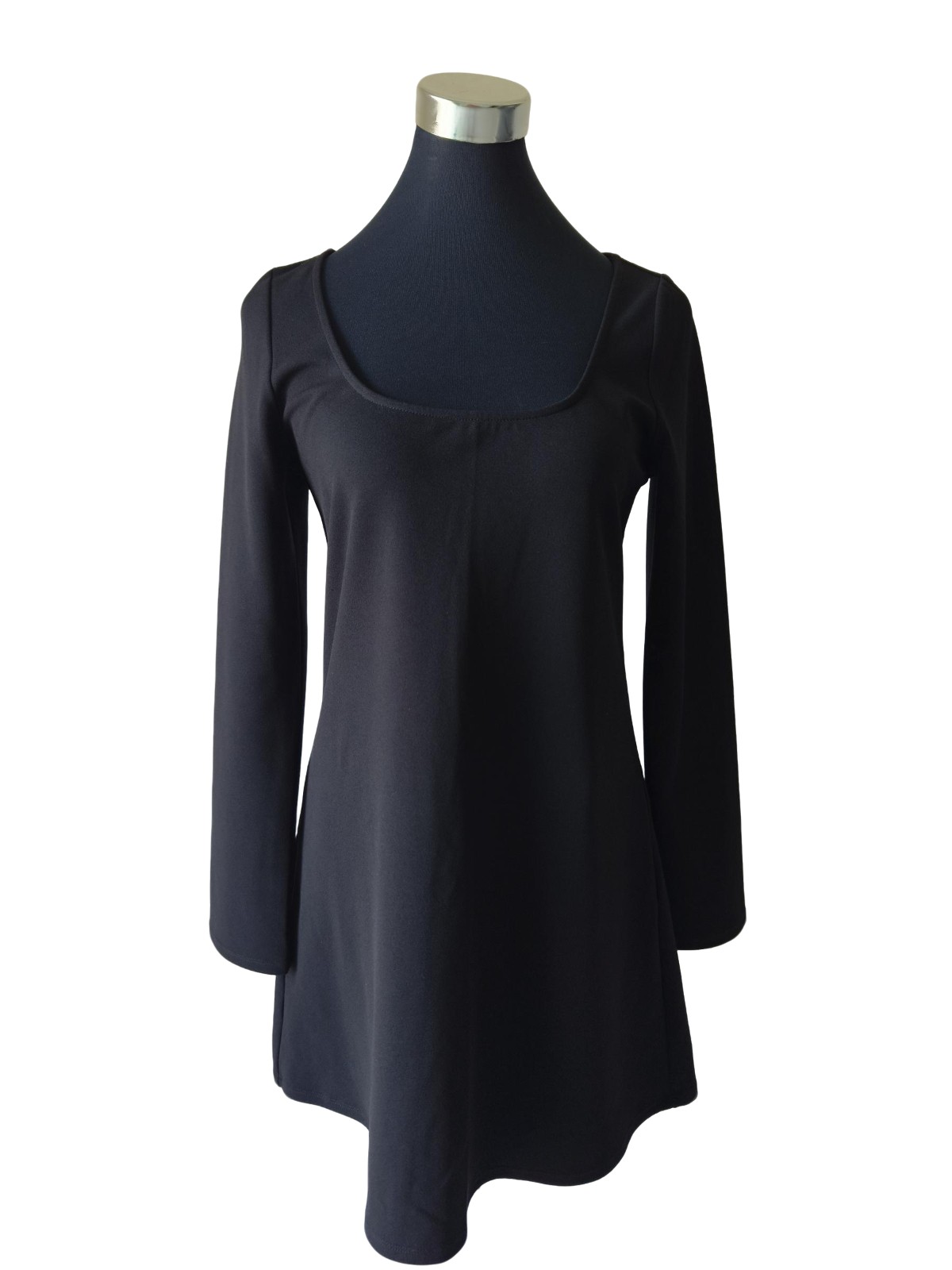 Cette robe noire signée H&M séduit par sa simplicité élégante et sa coupe légèrement évasée. Avec son col rond et ses manches longues, elle offre une silhouette fluide et intemporelle, idéale pour un look chic au quotidien ou une tenue de soirée discrète.