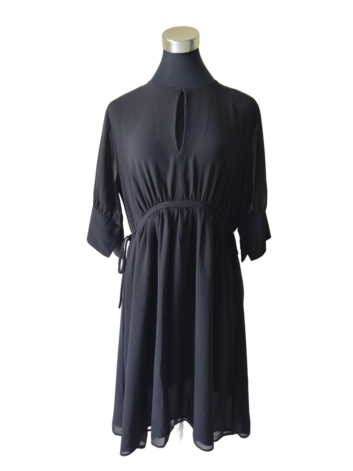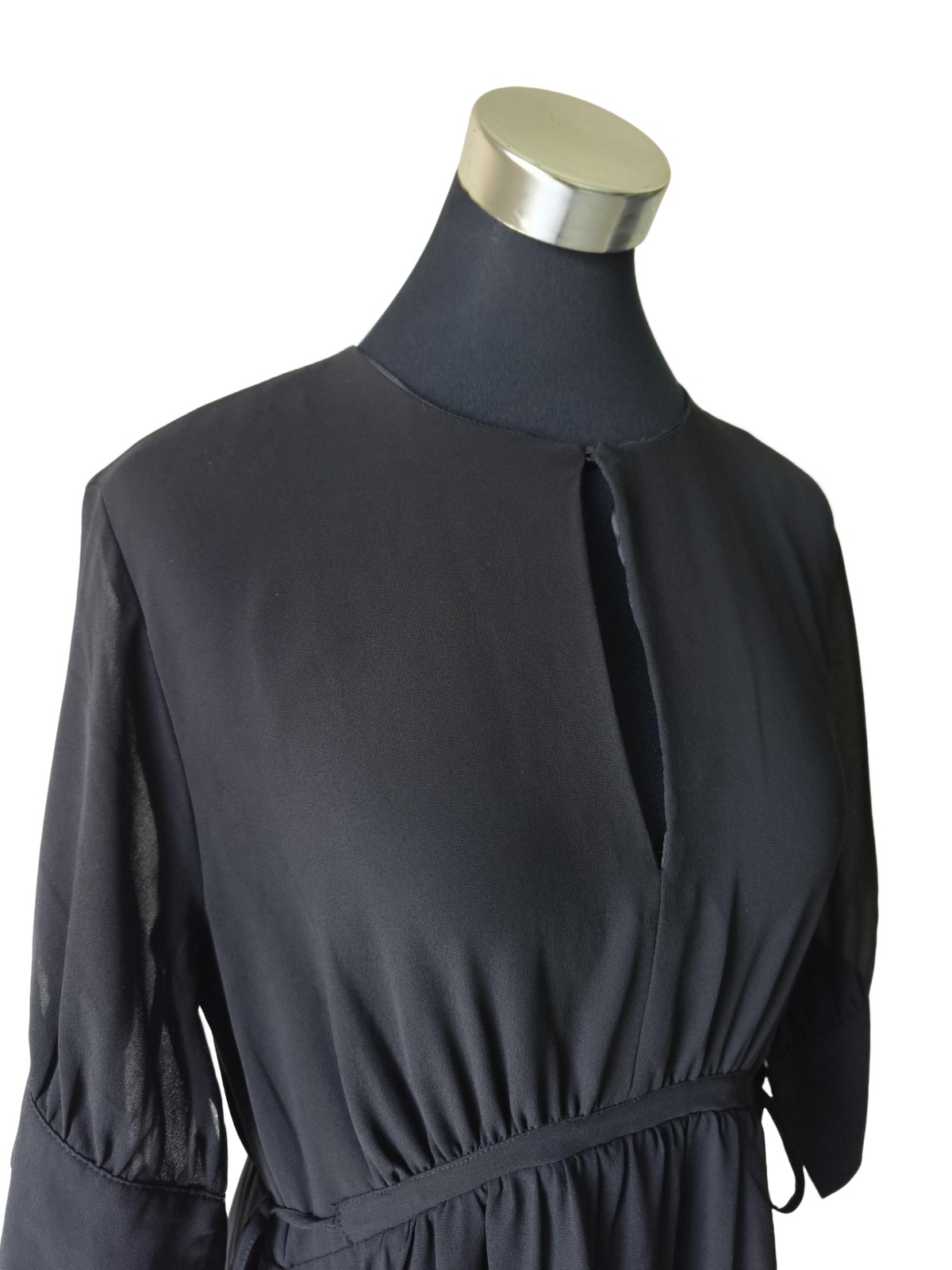 État : Occasion – Très bon état Cette robe noire signée H&M séduit par sa coupe empire et ses manches courtes légèrement bouffantes. Son encolure haute avec ouverture goutte et sa matière fluide lui donnent une allure bohème et envoûtante, parfaite pour les journées douces ou les soirées discrètes. – Taille : M – Couleur…