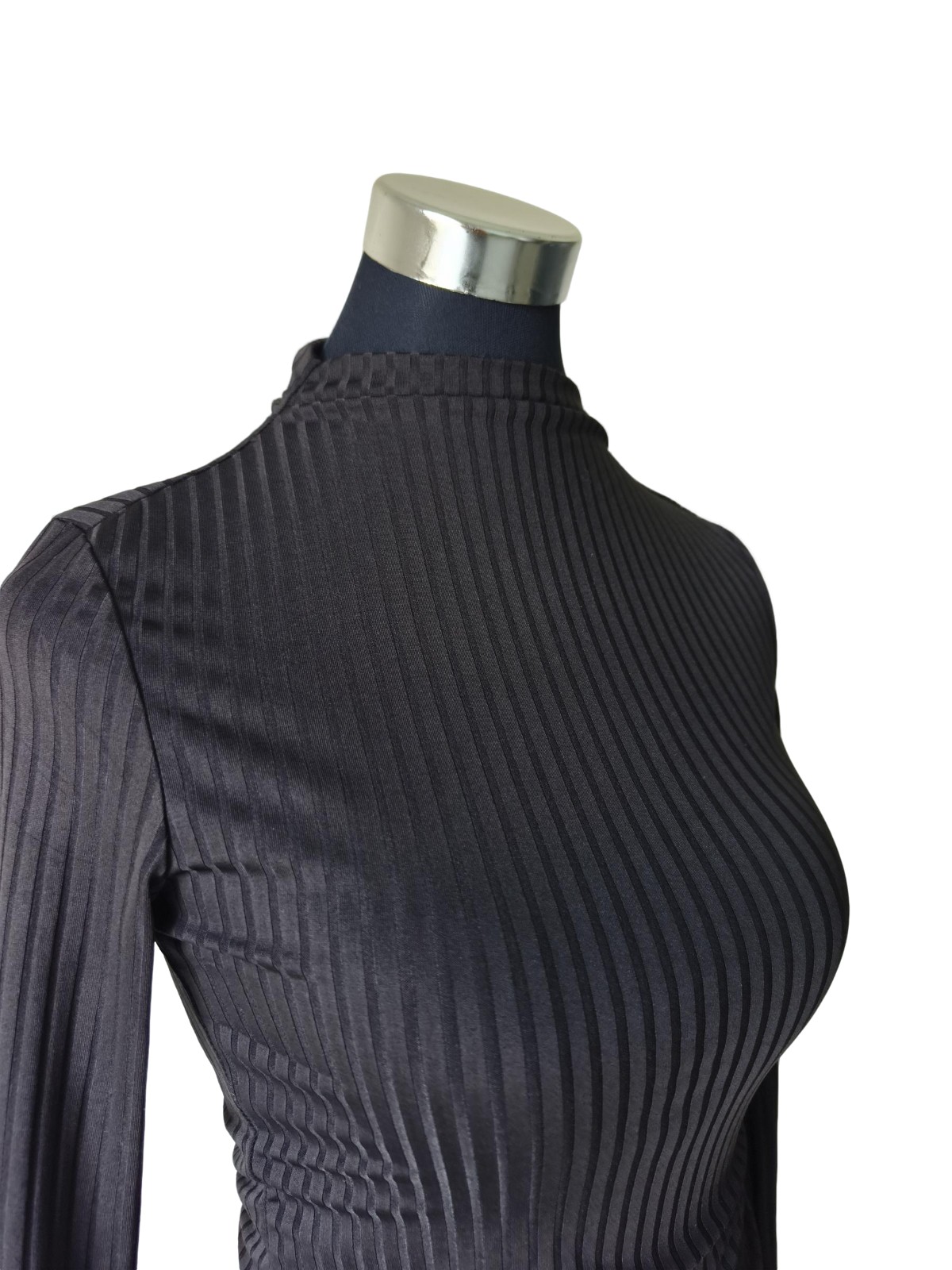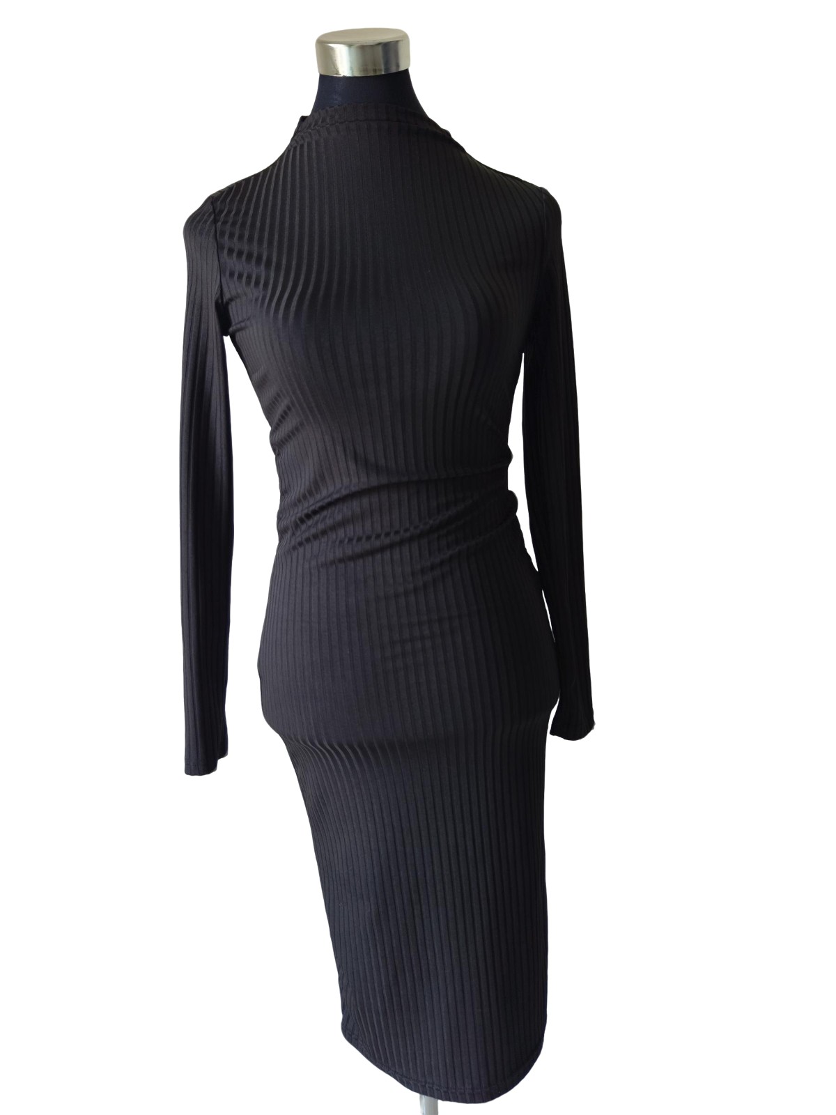Cette robe noire à manches longues séduit par sa coupe près du corps et son col montant. Avec sa texture subtile et sa longueur sous le genou, elle incarne une élégance moderne et affirmée, parfaite pour les looks professionnels ou les soirées minimalistes.
