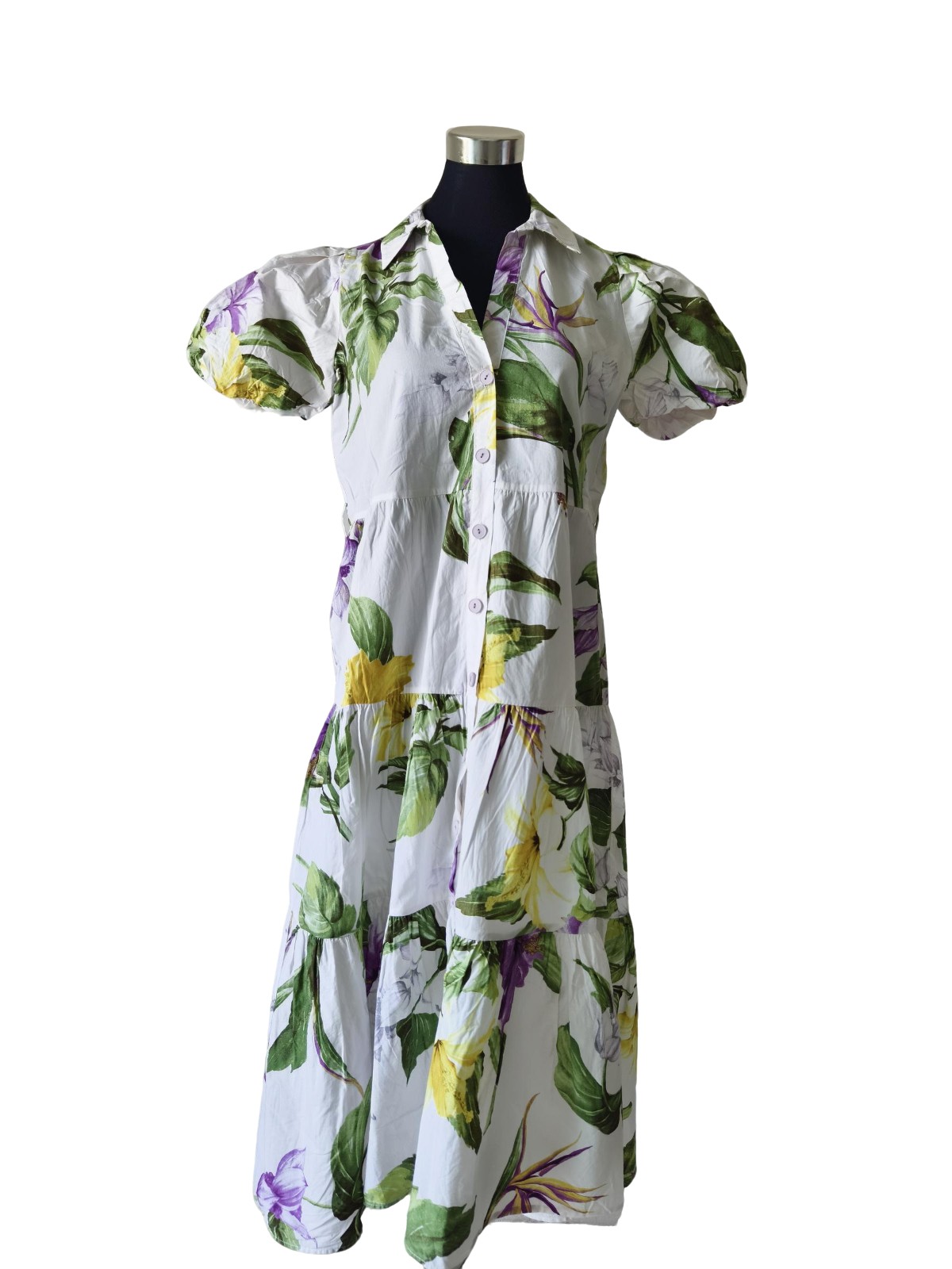 Cette robe midi fleurie signée Zara séduit par son allure rafraîchissante et son motif fruité. Avec son col chemisier, ses manches bouffantes et sa jupe ample à volants, elle incarne une féminité ensoleillée et festive, idéale pour les journées d’été.