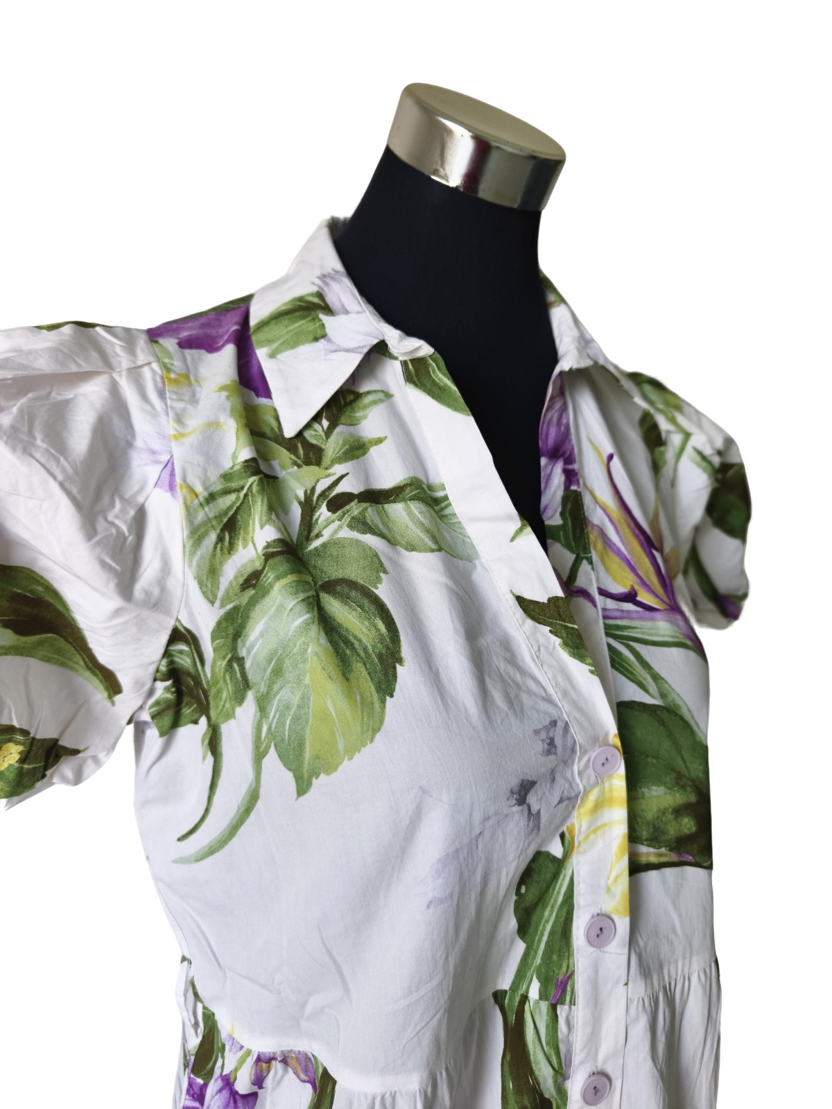 État : Occasion – Très bon état Cette robe midi fleurie signée Zara séduit par son allure rafraîchissante et son motif fruité. Avec son col chemisier, ses manches bouffantes et sa jupe ample à volants, elle incarne une féminité ensoleillée et festive, idéale pour les journées d’été. Taille : M Couleur : Blanc imprimé floral…