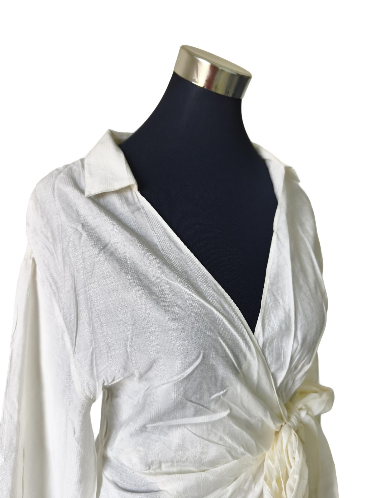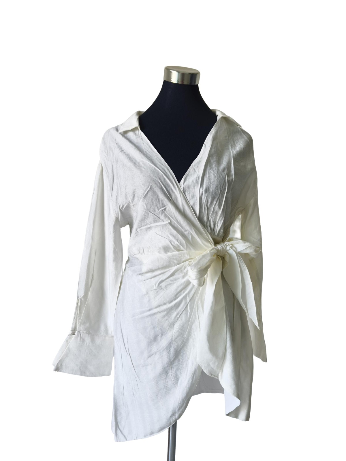 Cette robe blanche signée Zara séduit par sa coupe portefeuille et ses délicates broderies. Avec son col ouvert, ses manches longues terminées en volants et son grand nœud à la taille, elle incarne une féminité douce et raffinée, parfaite pour les journées lumineuses.