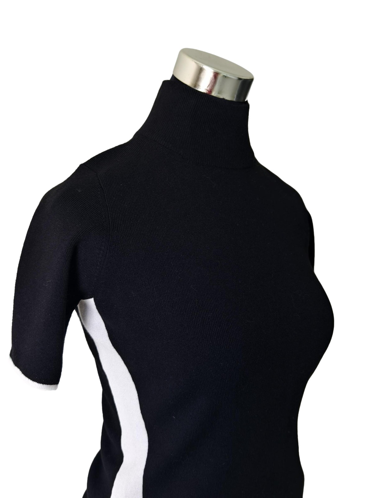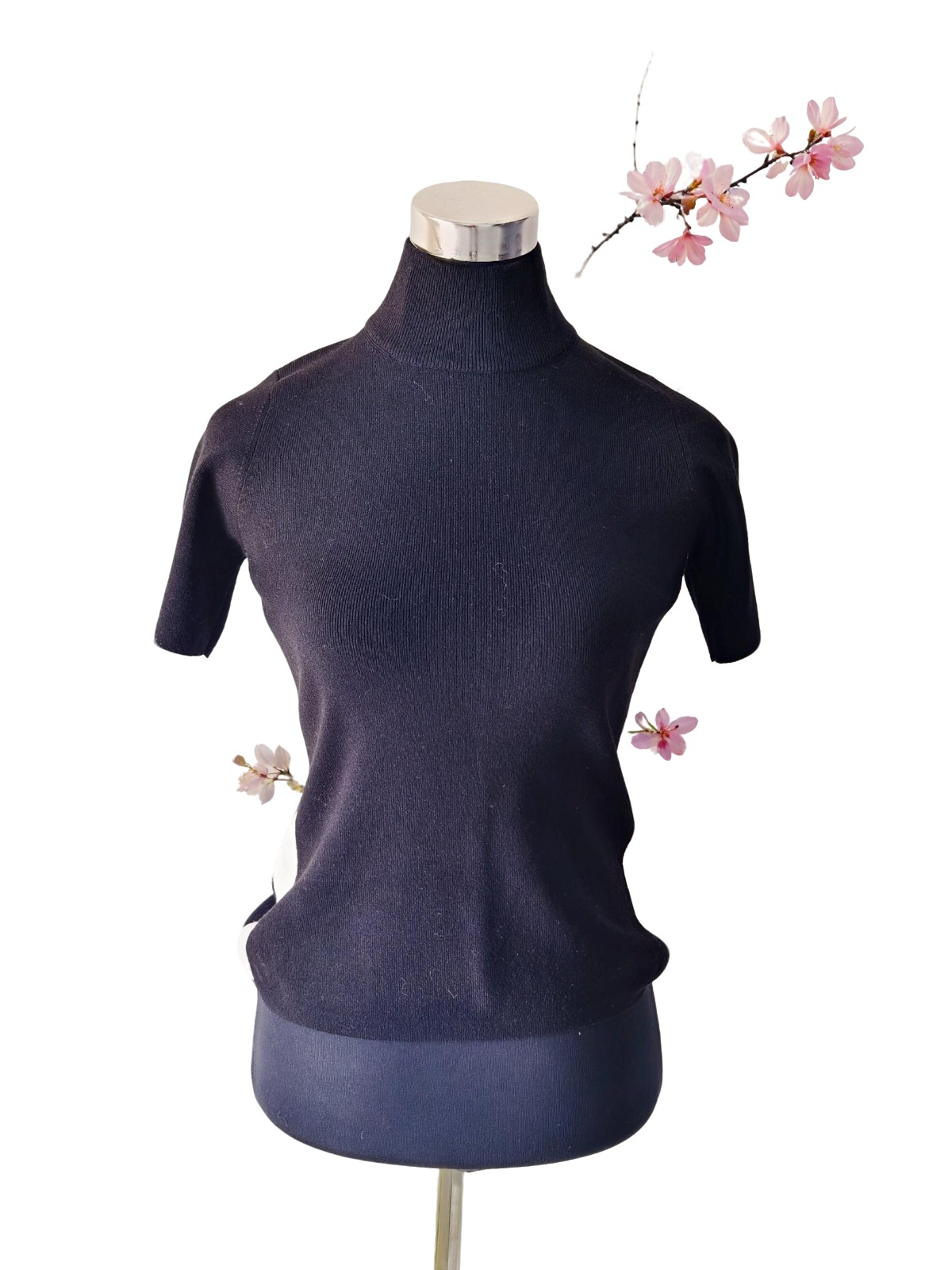 Ce tricot noir signé Brookshire se distingue par son col montant et son motif texturé symétrique. Avec ses manches courtes et sa coupe ajustée, il apporte une touche graphique et sophistiquée à votre dressing.