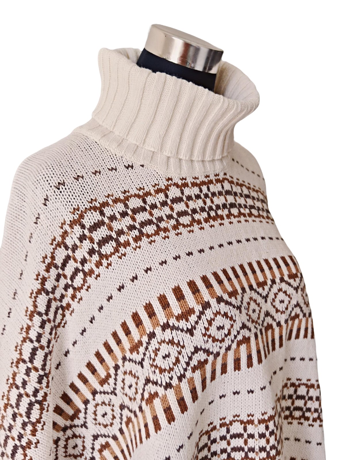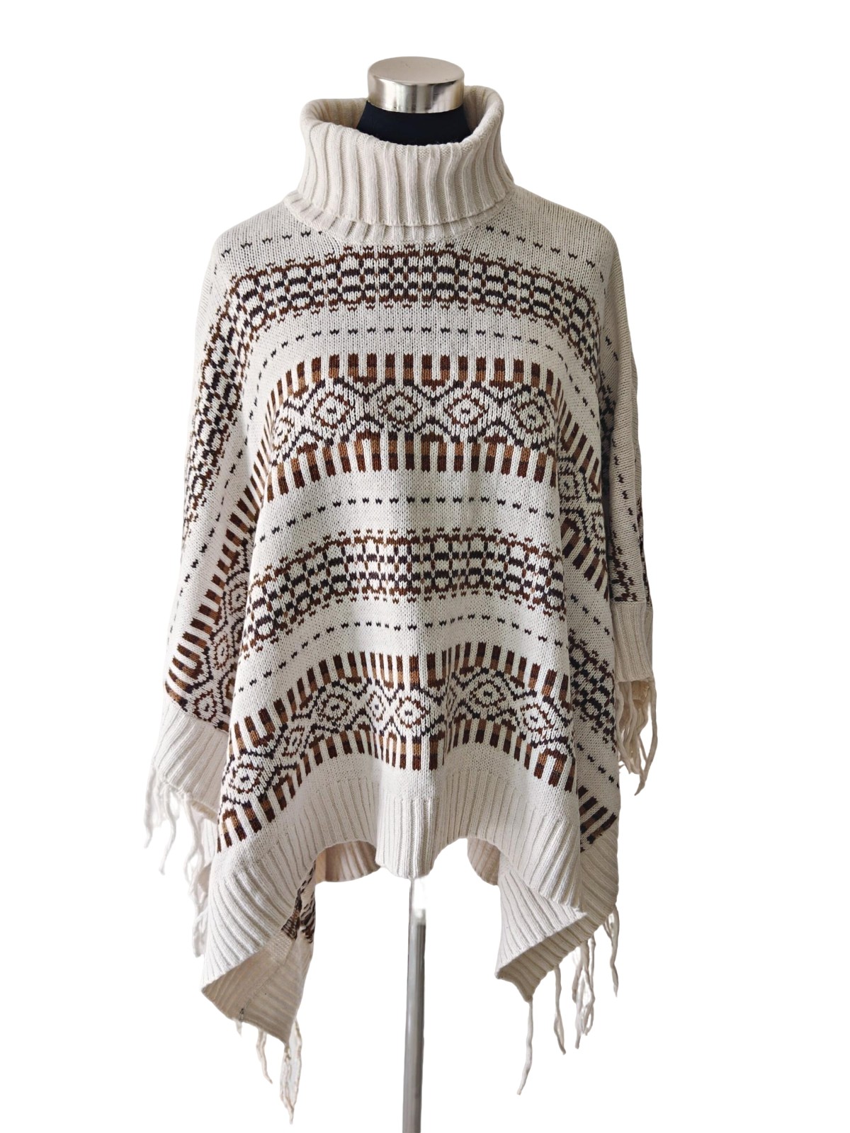 État : Occasion – Très bon état Ce poncho signé H&M séduit par son motif ethnique dans des tons naturels et son col roulé. Avec ses finitions à franges, il apporte une touche de chaleur et de style à votre dressing. Taille : Standard Couleur : Beige & brun Style : Boho & chaleureux Marque…
