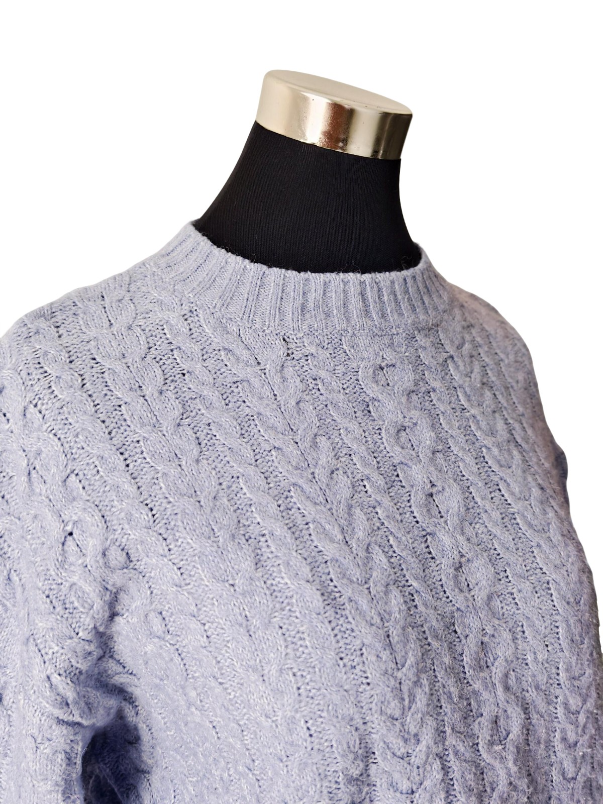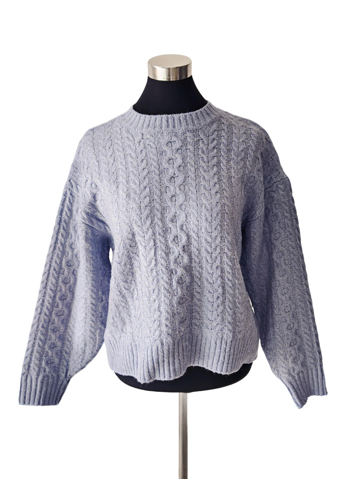 Ce tricot signé Mango séduit par son motif torsadé et sa teinte douce. Avec sa coupe légèrement ample et son col rond classique, il offre un style cosy et féminin, parfait pour les journées fraîches.