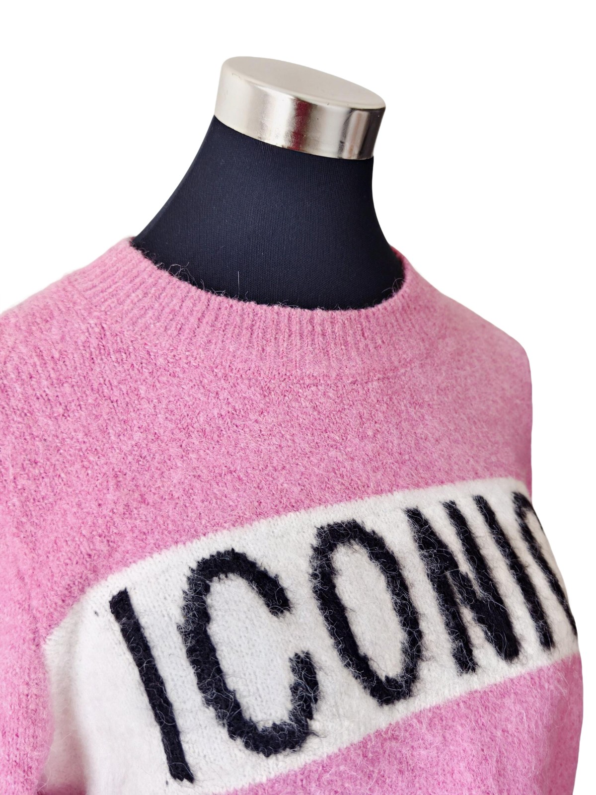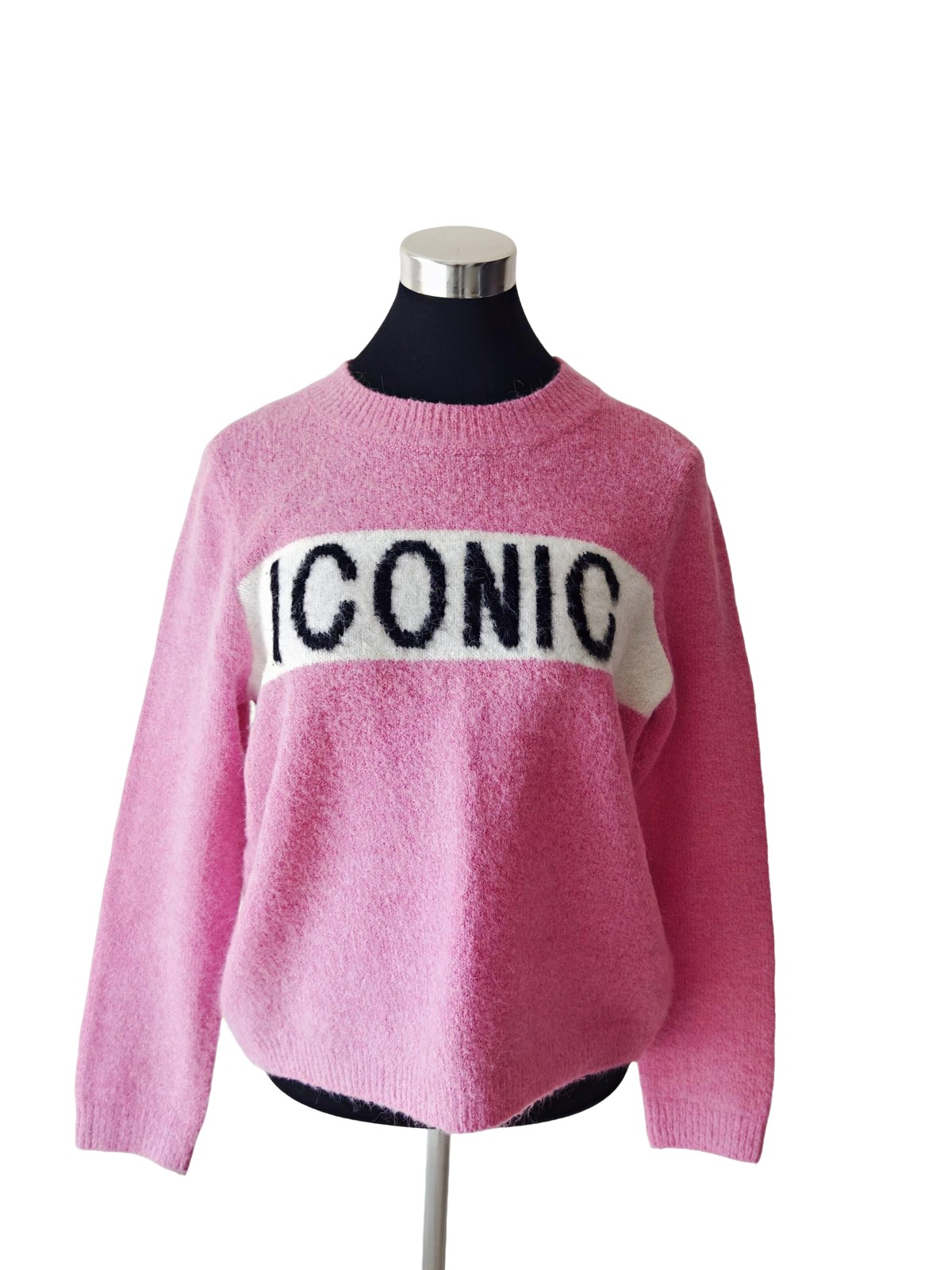 Ce tricot doux signé Primark séduit par sa coupe confortable et son style affirmé. Avec son inscription “ICONIC” en contraste sur fond rose, il apporte une touche tendance et décontractée à vos tenues du quotidien.