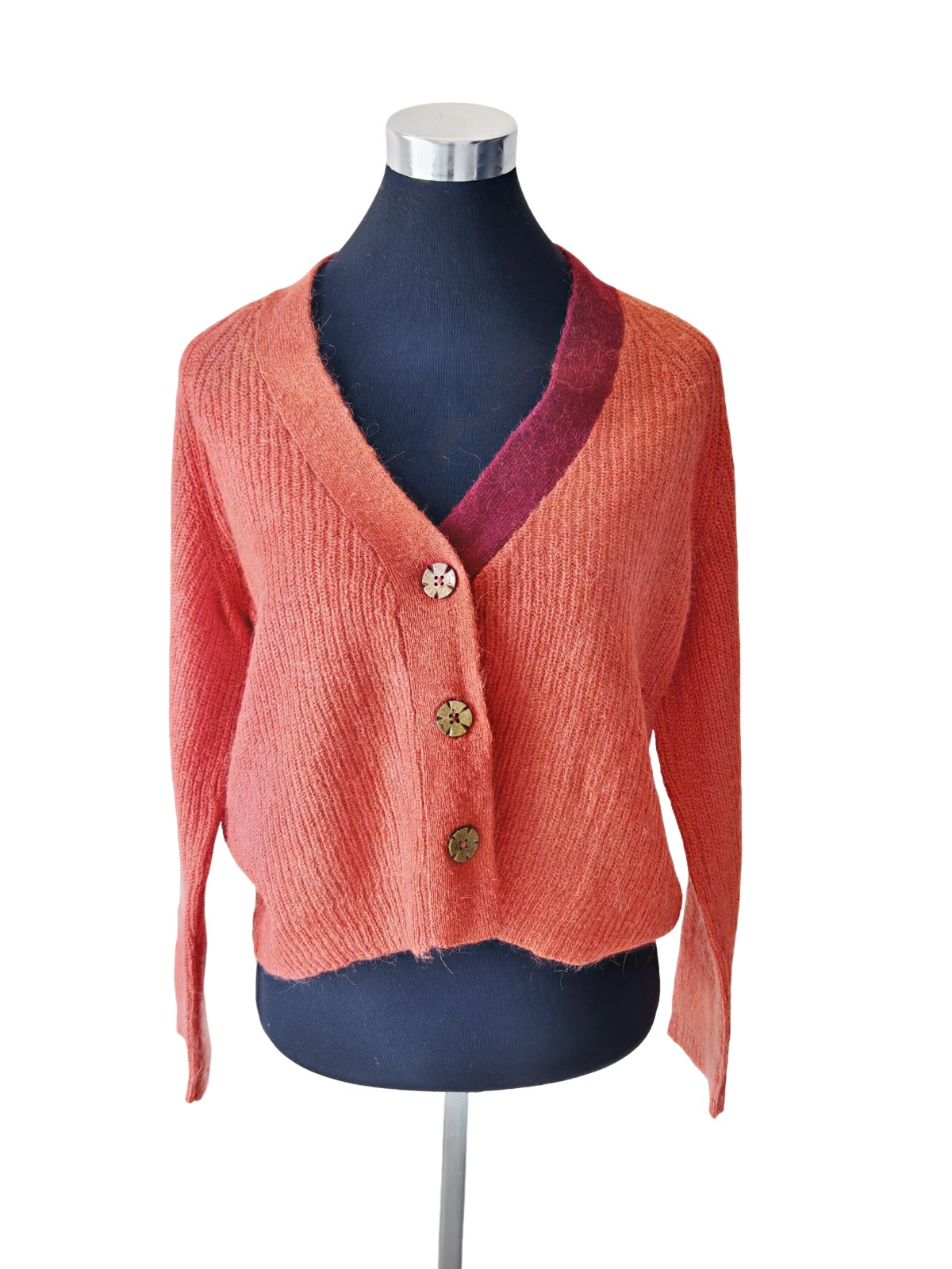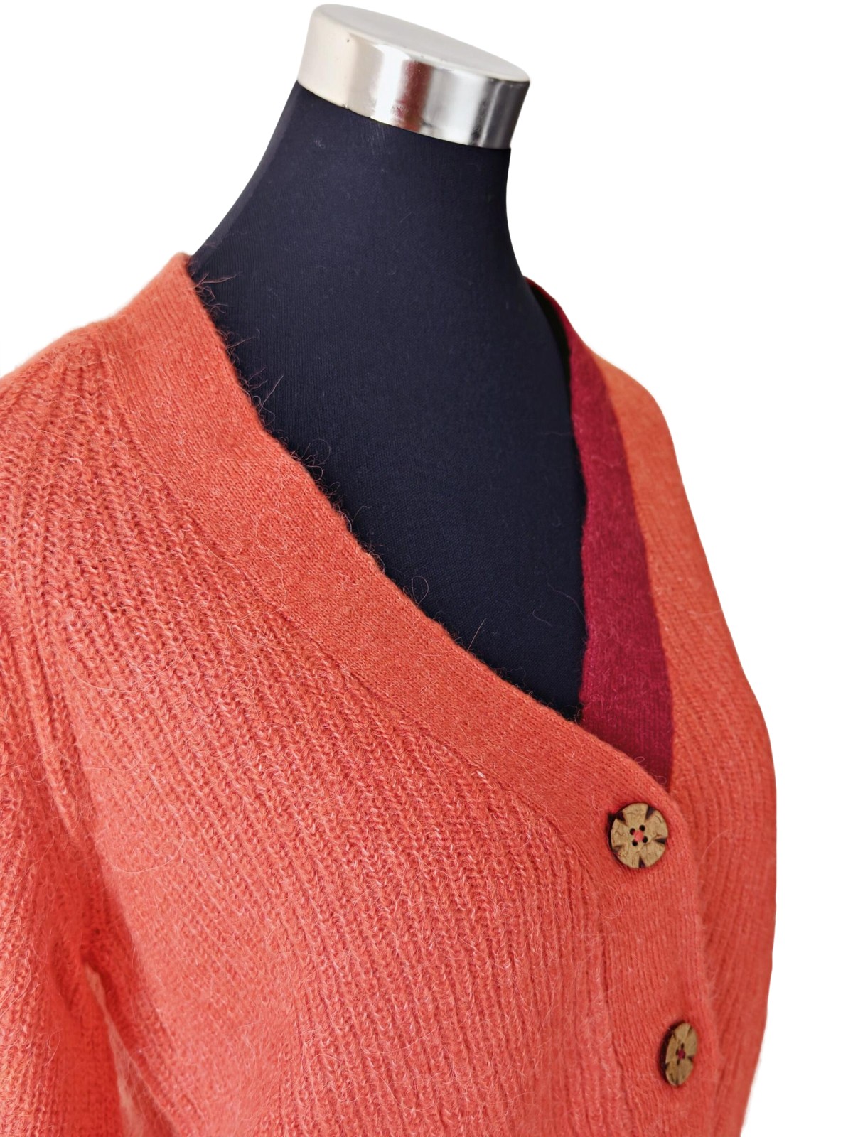 Ce tricot bicolore signé White Tuff mêle harmonieusement rouge et bordeaux. Avec ses boutons et son col en V contrasté, il apporte une touche chaleureuse et originale à votre dressing.