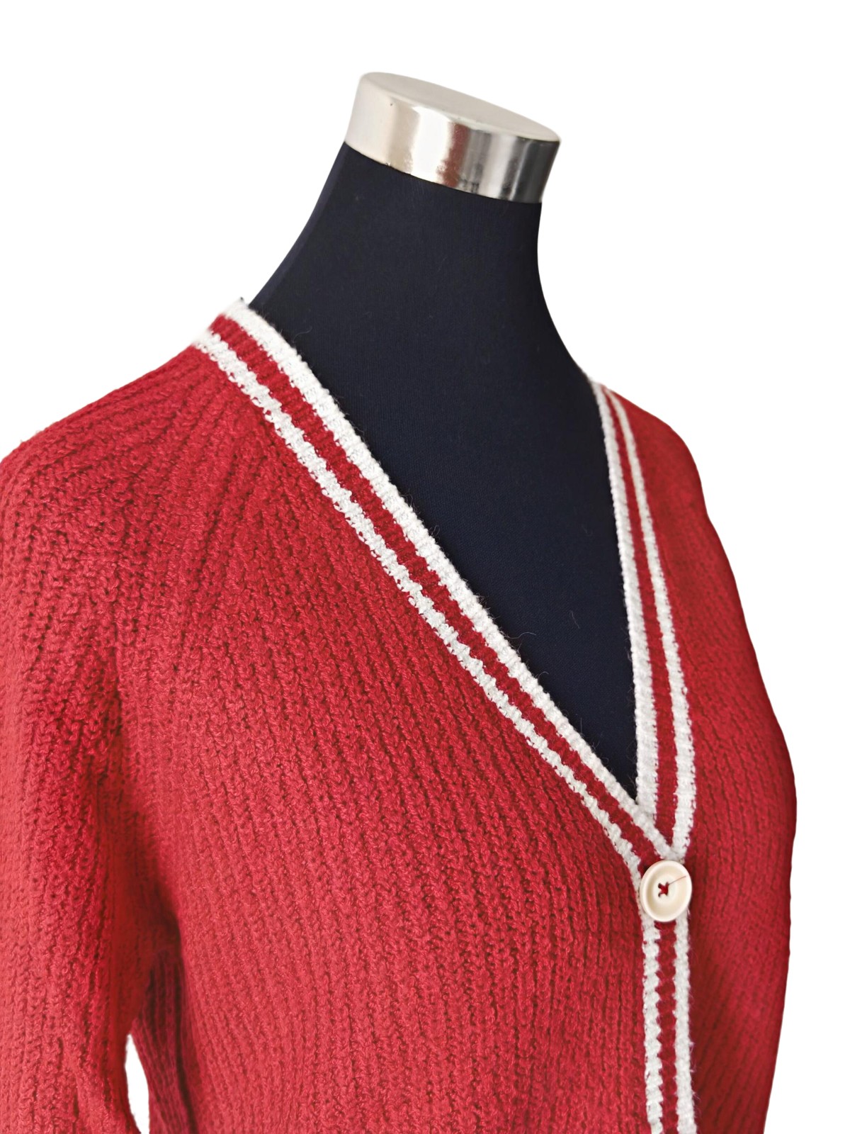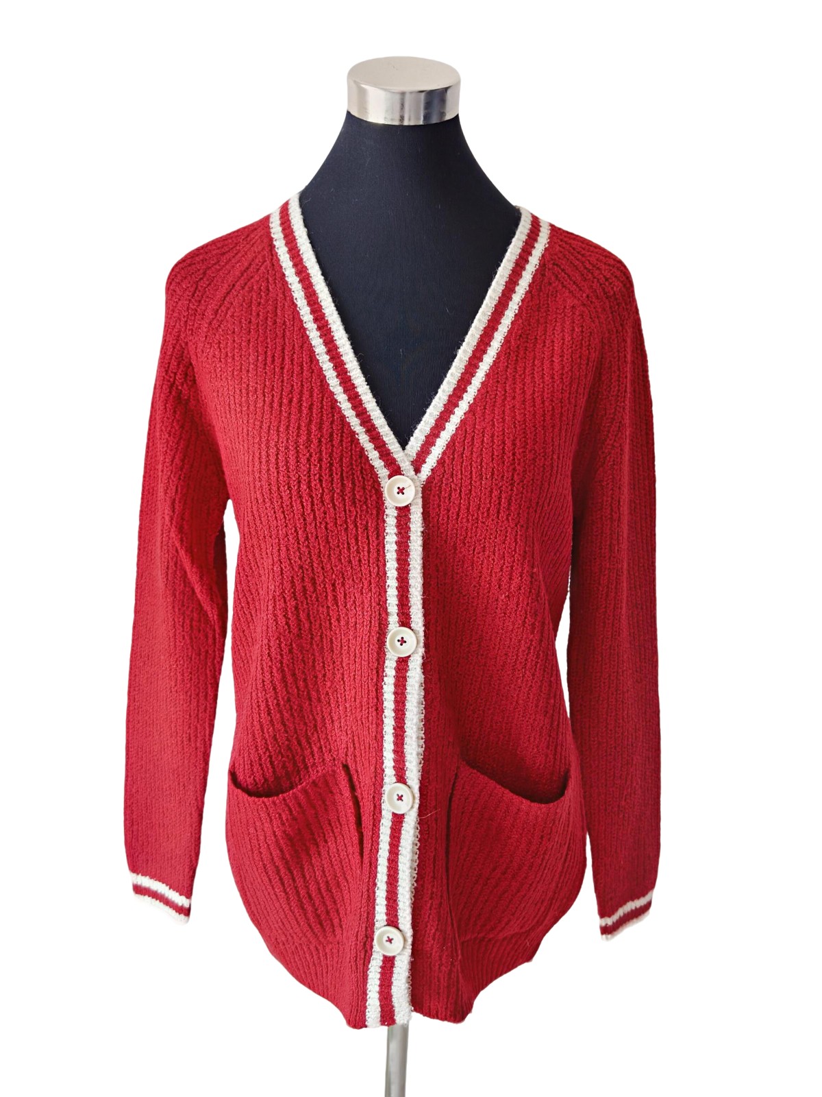 Ce cardigan rouge signé Zara séduit par ses finitions contrastées en blanc et sa coupe classique revisitée. Avec ses poches plaquées et ses boutons assortis, il apporte une touche preppy et chaleureuse à vos looks d’hiver.