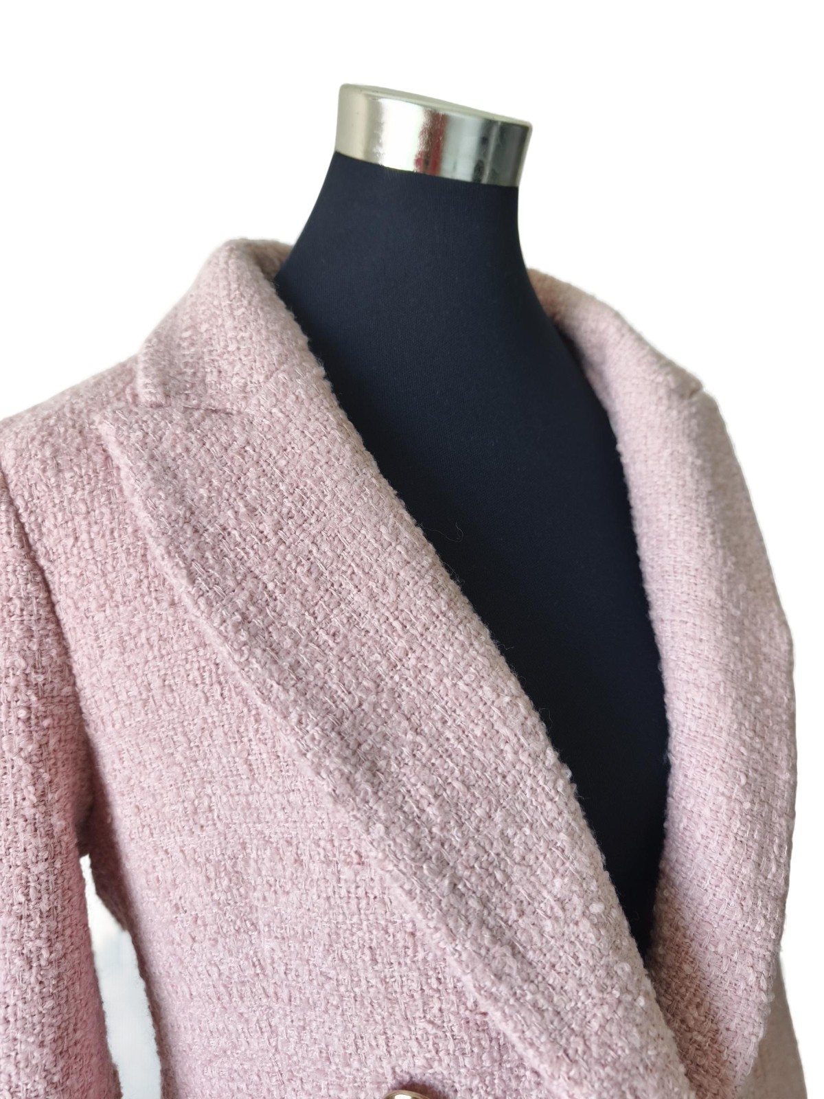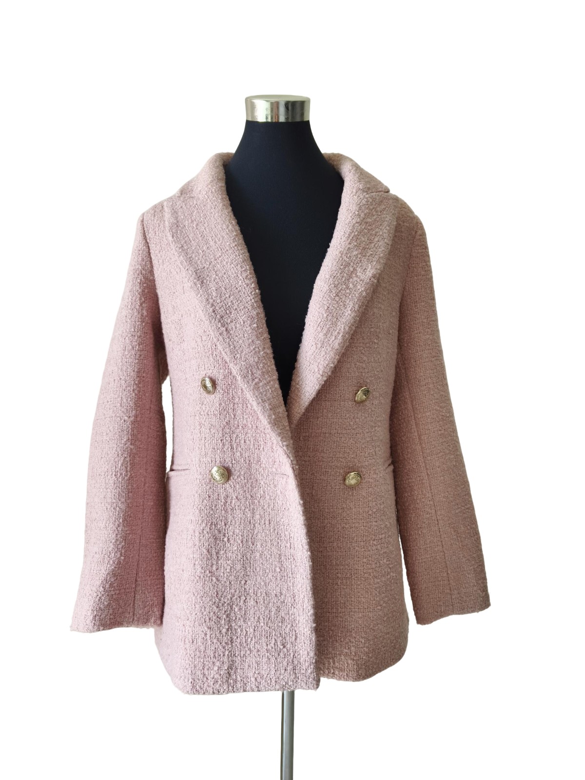 Cette veste rose poudré signée H&M séduit par sa texture bouclée et ses boutons dorés. Avec sa coupe droite et son col à revers, elle incarne une élégance douce et contemporaine, parfaite pour rehausser vos tenues de saison.
